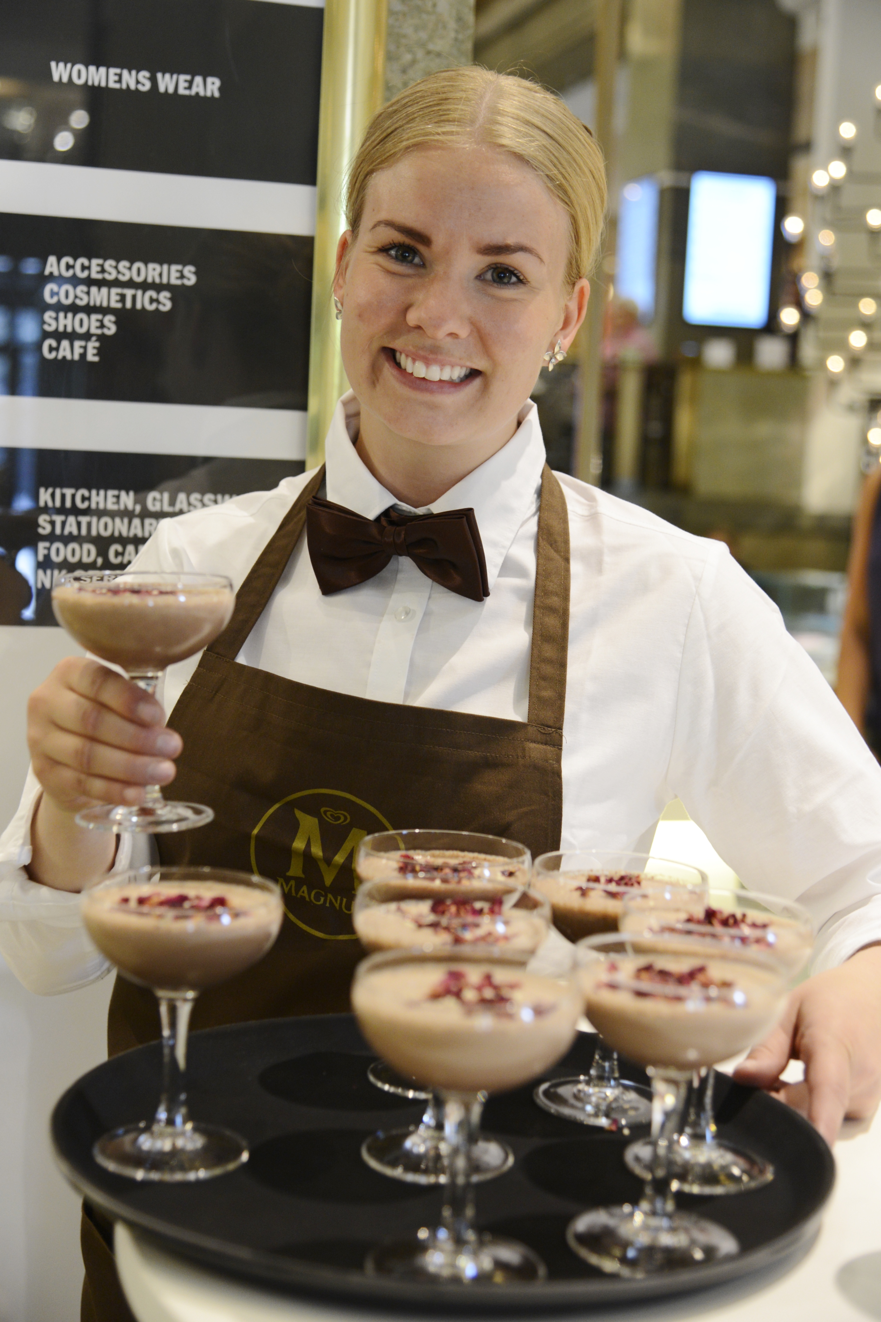 På löpande band tillverkades glassar, man väljer först vilken choklad man vill ha på glassen, vit eller brun choklad, sen väljer man tre toppings som mixas och sprinklas över glassen, man låter glassen få stelna så man får det här ”magnum-kracket” sen får man njuta av sin alldeles egna Magnum glass.