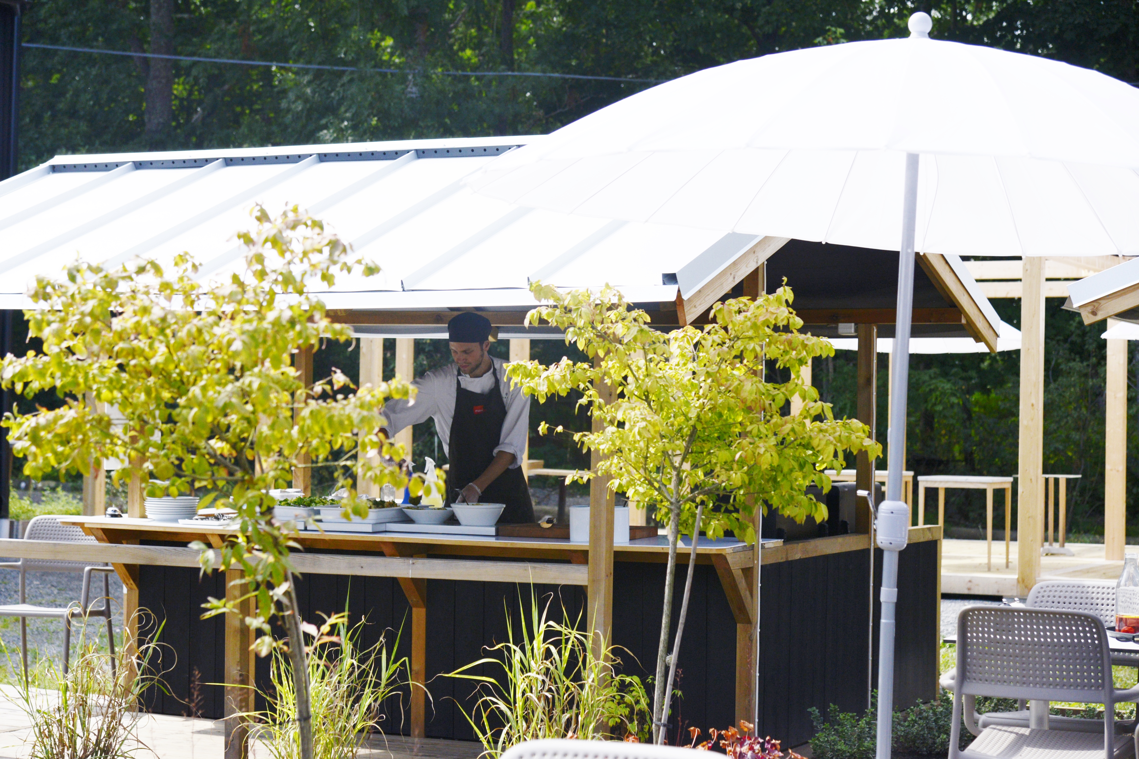 På innergården i trädgården stod en kock och grillade inför dagens grillbuffé
