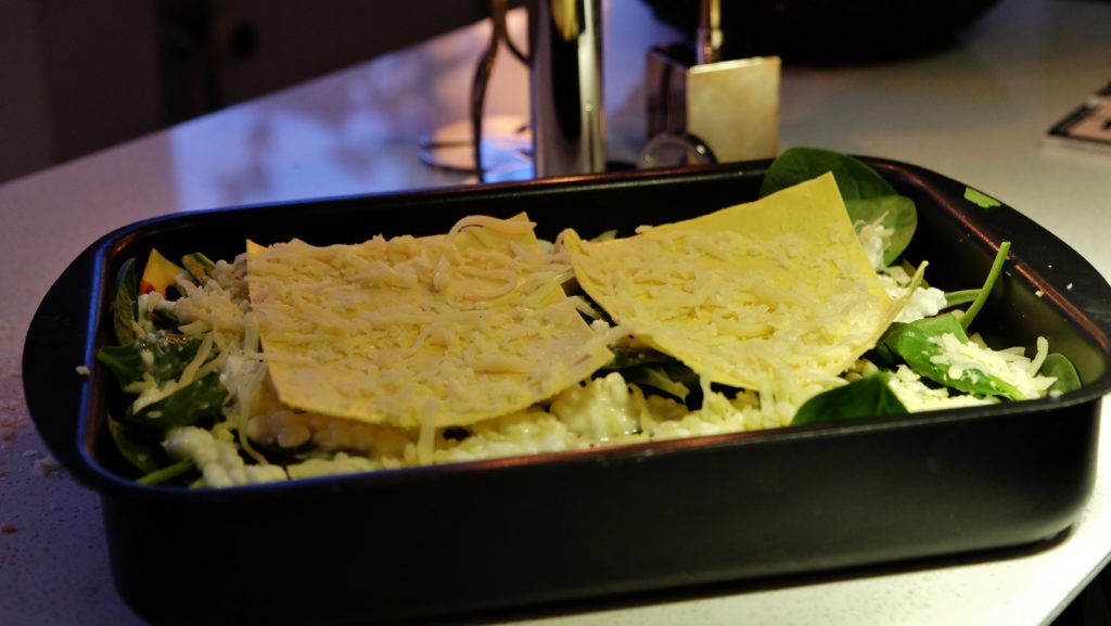 Varva sen tomatsåsen, lasagneplattorna, keson och bladspenaten i en ugnsform.