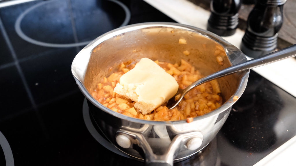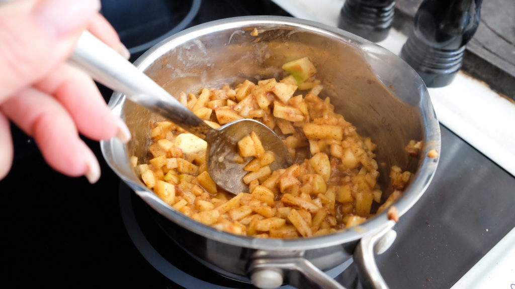 Hacka äpplet i små bitar, blanda med socker, kanel och salt. Värm i en kastrull (små bubblandes) i ca 5 min så äpplena blir mjuka.