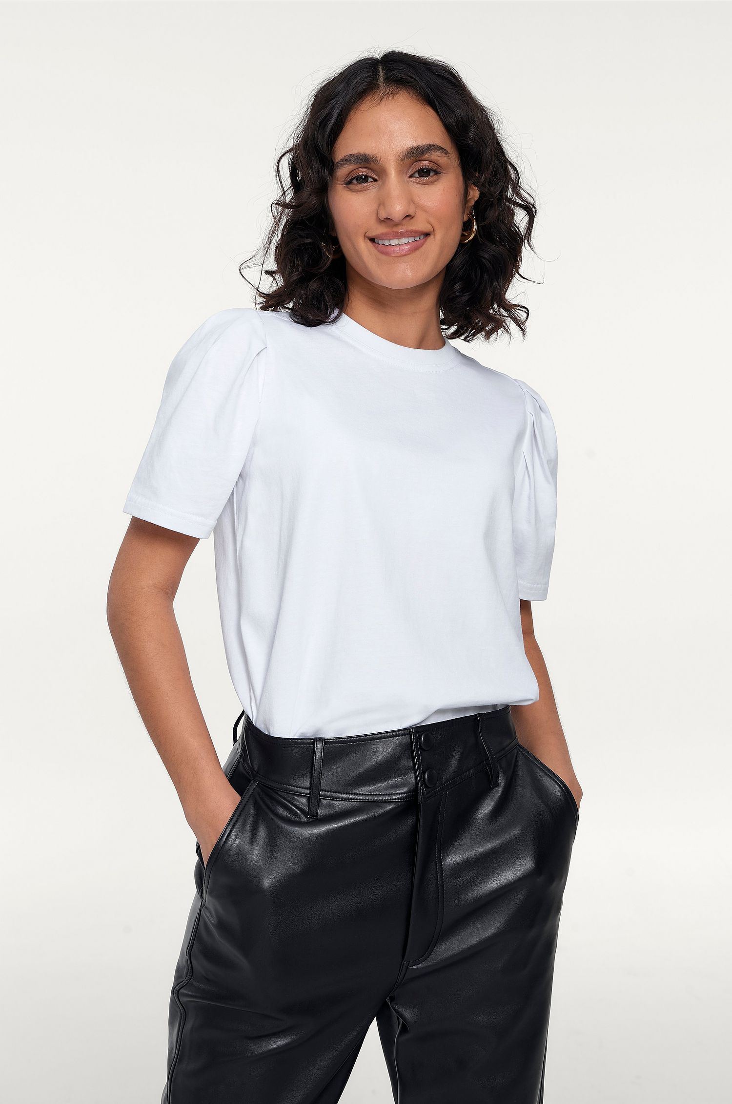 Topp med puffärm (så snygg) finns även i svart – svarta skinnbyxor (imitation)